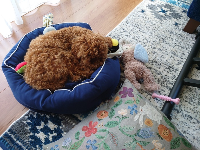 おもちゃは、ちゃんと自分のマットの周りに集めております。