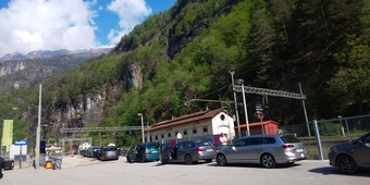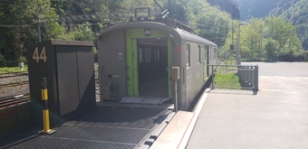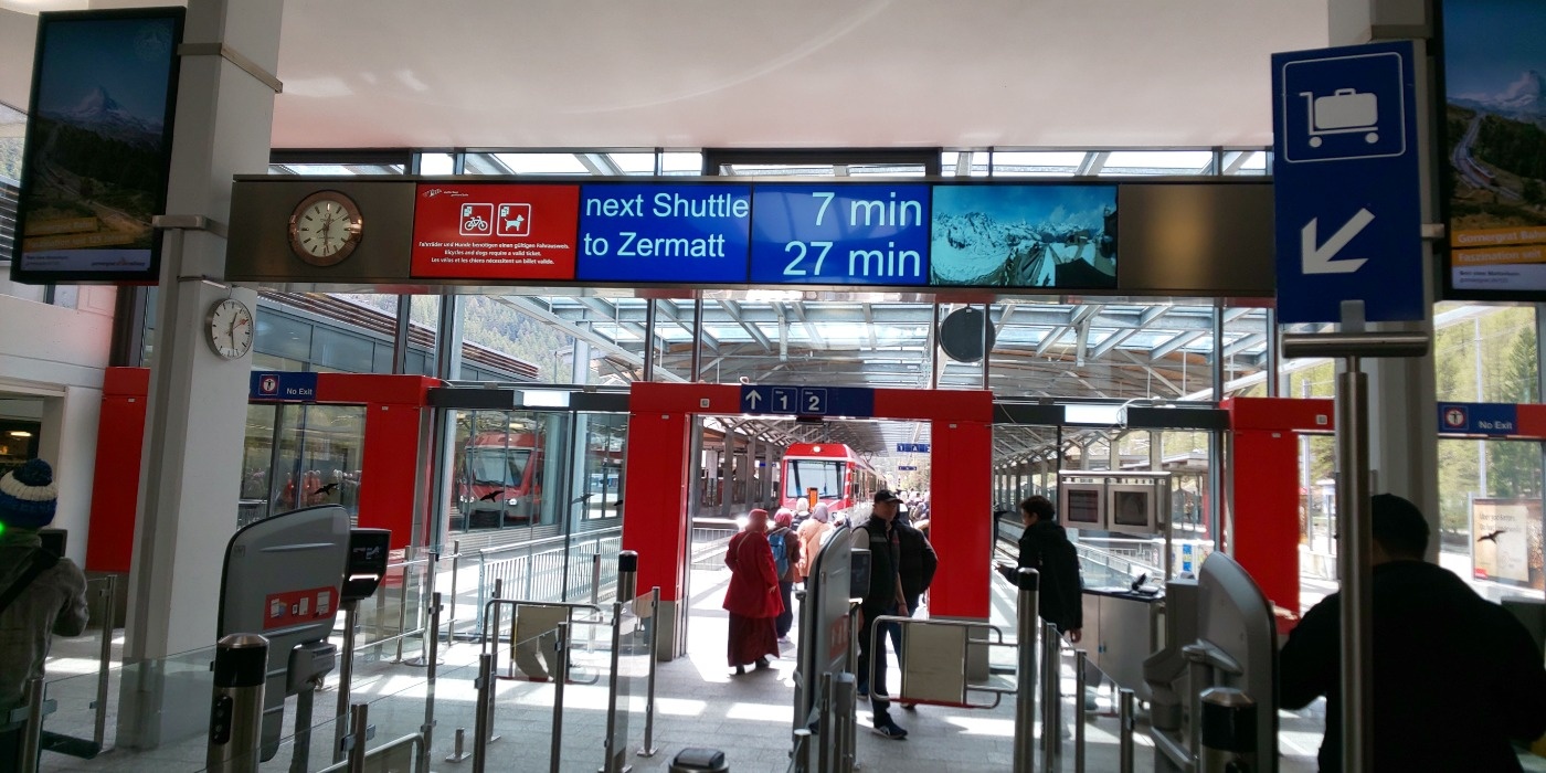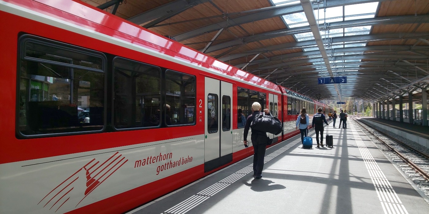 ・テッシュに着くと、駅併設の大きな駐車場があります。入口にバイクの進入案内は無いですが入って大丈夫。そこからツェルマットには比較的頻繁にシャトル列車が出ているので予約は不要。