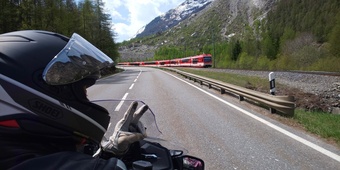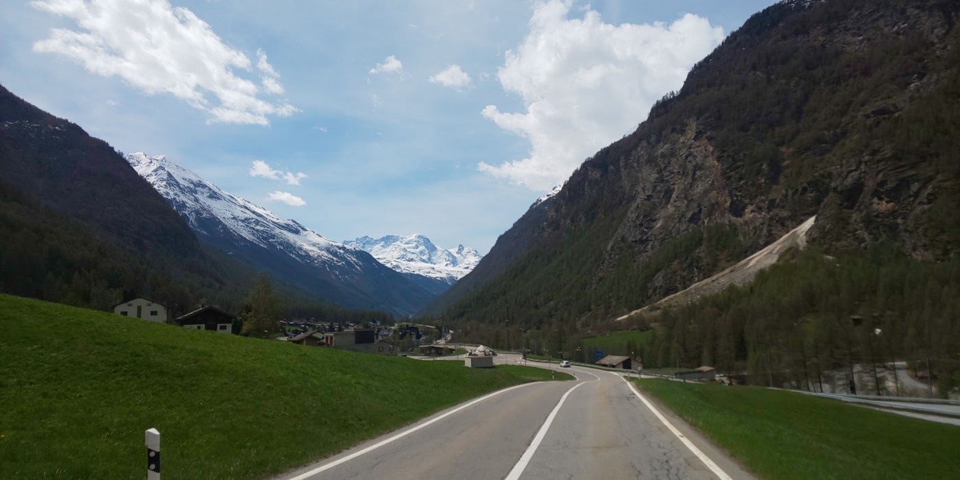 既にここまで、イタリアへの山越えでスイスの景色に感動しきりだったが、更にこちらは趣きを増し、スイス名物の赤列車と並走しながら、インカム越しに世界の車窓からのBGMを口ずさみ、適当なナレーションを加えながら山道を走り流す。