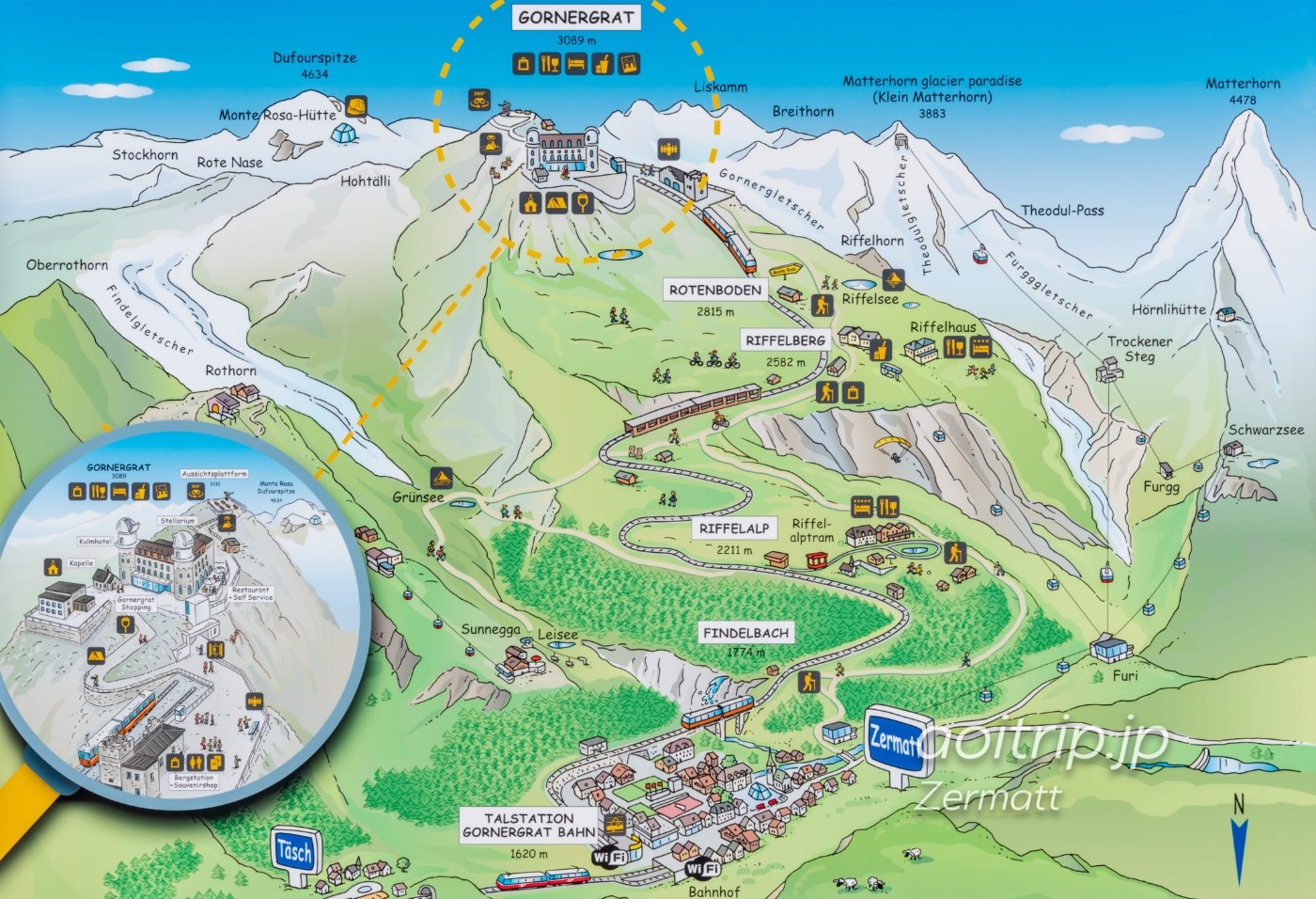 まだまだ余裕の14時、宿に荷物を預け、念のためカッパ持参でコルナーグラート鉄道へ。