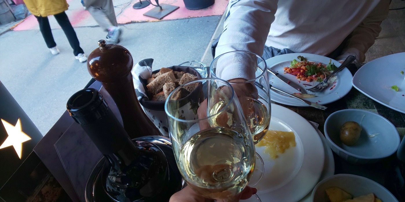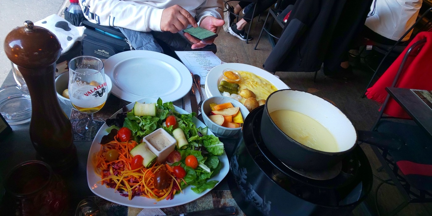 お約束のチーズフォンデュとラクレットをアテに、ちょっと甘めのスイスワインは悪くない、いやスイスワインうまい!