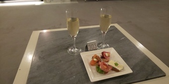 遅刻者は休憩時間まで劇場内に入れず、バーコーナーのシャンパンで初日達成を祝う。