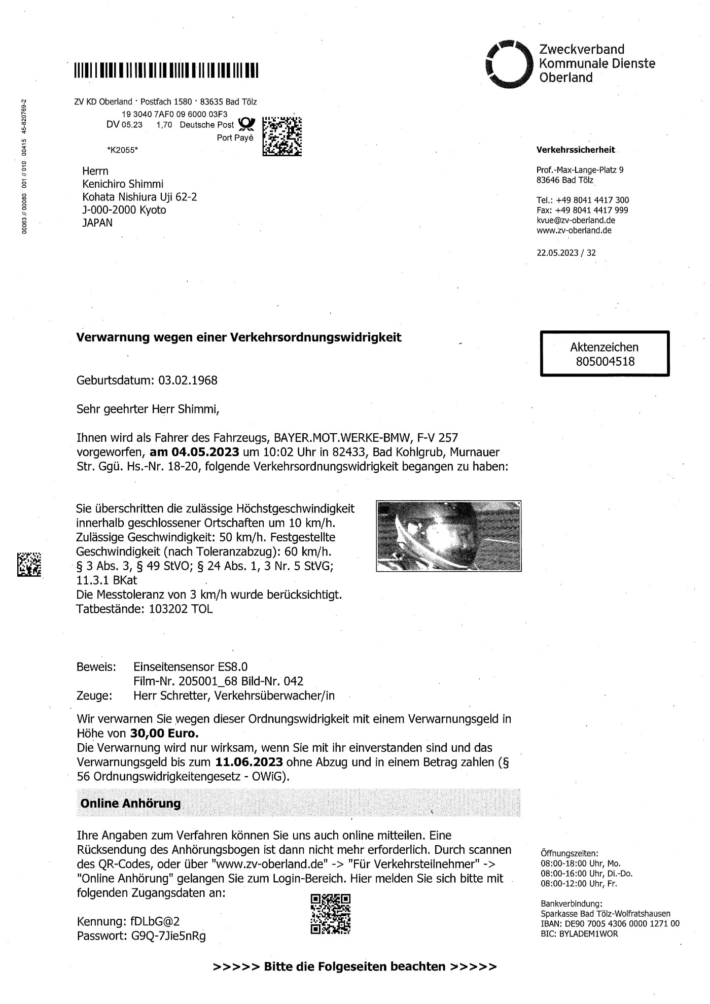 市街地内の50km/h規制で、10km/hオーバーのスピード違反、30ユーロの罰金でした。(笑)