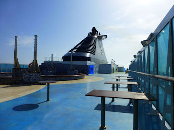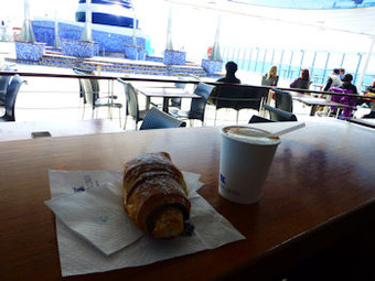 最上階デッキに出て、ピーカンの地中海、チョコワッサンとカプチーノ。