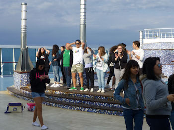 待ちきれない人が屋上デッキにあふれ、港の向こうに薄っすらとサグラダファミリアが見える。