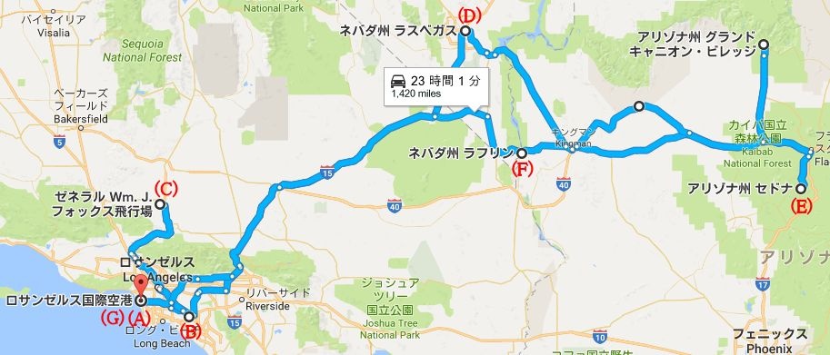 (B)アナハイム(ディズニーランド)←→ (C)ランカスター(航空ショー)