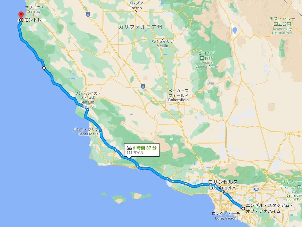アナハイム→モントレー・378miles(605km)・晴れ・65°F(18℃)